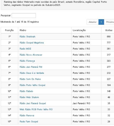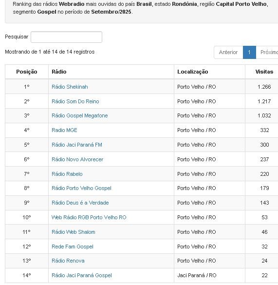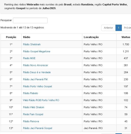 O ranking das rádios web do segmento Gospel na região de Porto Velho, monitorado entre julho e outubro de 2025, revela uma performance de destaque da Rádio Shekinah. Em todos os meses analisados, a emissora manteve-se firmemente na primeira posição, superando consistentemente as demais rádios do segmento na capital